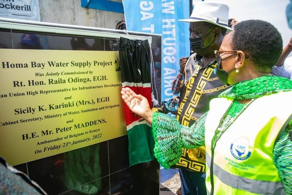 African Union High Representative for Infrastructure Development Rt. Hon Raila Odinga together with Cabinet Secretary Ministry of Water, Sanitation and Irrigation Sicily Kariuki (Mrs), EGH and Belgium Ambassador to Kenya Mr. Peter Maddens today commissioned Homa Bay cluster Water Supply Project.